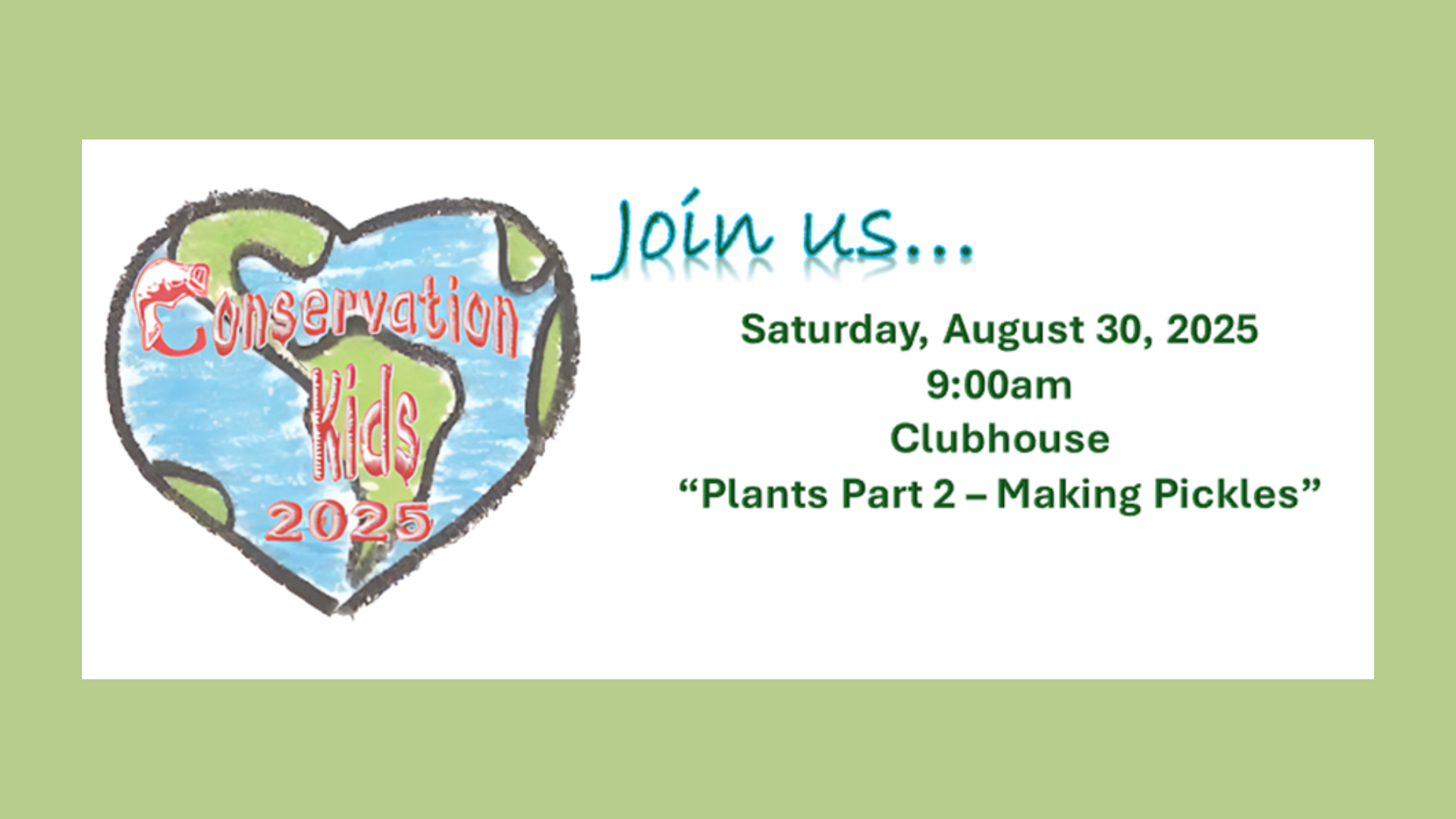 Don’t miss Conservation Kids next Saturday!! We are going to make pickles using cucumbers that we planted back in May!! We will be meeting an hour earlier to be sure we can clean up in time for the members who have the clubhouse reserved. Come see the “fruits of our labor” in action. The pickles we make will be sold during our Fall Hunting and Fishing Days in just a few weeks. The proceeds will help pay for Conservation Kids next year.