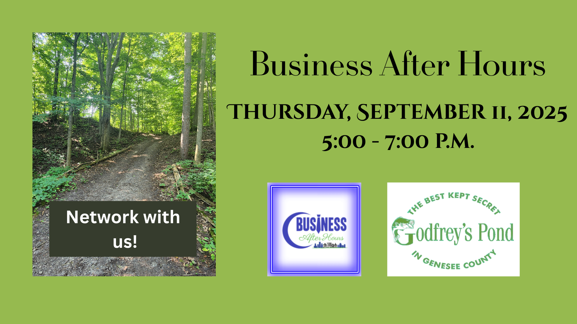 Looking to expand your network and connect with fellow professionals in the Genesee County area? Then look no further than this dynamic Business After Hours event! In collaboration with the Genesee County Chamber of Commerce, we invite you to come and enjoy the serene and picturesque setting of Godfrey’s Pond, offering the perfect atmosphere for meaningful conversations.