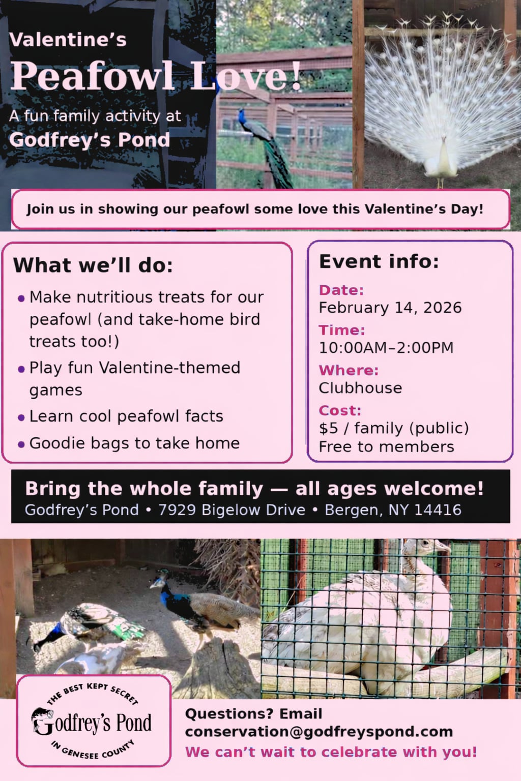 Celebrate the spirit of Valentine’s Day this year by joining us for a delightful new event that shines a spotlight on our feathery friends in the Fish & Fowl Program. We invite you to experience the beauty and charm of peafowl, members of the magnificent pheasant family, and learn why these creatures captivate hearts everywhere. We will have a LIVE peacock on display. This event is open to the public – so bring the family and have some fun!